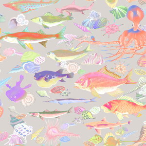 な世界が描かれています。 日本画風のタッチなのに、和にも洋にもなじむポップな配色はインテリアにもおすすめです 「魚の群れ」は英