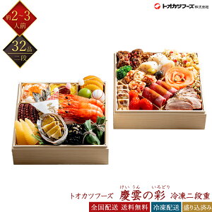 商品詳細 屋号 トオカツフーズ 商品名 トオカツフーズ 慶雲の彩(けいうんのいろどり) 冷凍二段重 商品番号 tookatu-keiun ジャンル 和洋 タイプ 盛込み済 品目数 32品目 人数前 約2〜3人前 段数/ サイズ 二段/...
