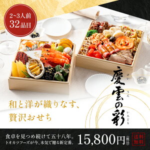 商品名 和洋おせち「慶雲の彩」(おせち料理詰合せ) メニュー(全32品目) 【一の重(和風)】 金時人参入りなます/いくらの醤油漬け/栗の渋皮煮/鳴門金時芋きんとん/伊達巻/若桃甘露煮/手まり餅/瀬戸内海産...