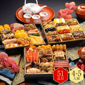 和洋折衷の食材が51品詰め込まれた豪華絢爛の華やかなおせちです。厳選した魚料理やお肉を使った食材を隙間なく華やかに詰め込んだ料理は、お子様からご年配の方、大人数でも楽しめる至高のおせちです。 ○名称:おせち ○内容量:【一