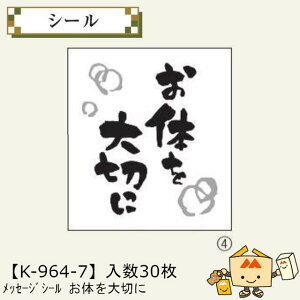 商品名 メッセージシール お体を大切に 品番 K-964-7 サイズ(mm) 45×50 小口入数 1冊(30枚入) 重量 0.52g 材質 雲竜和紙 メーカー 株式会社ヤマニパッケージ 販売者 株式会社梶本...