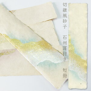 耳付きの石州和紙を使用した切継ぎ風のデザインの短冊です。 金銀の砂子で切継ぎ風の柄を描き、切箔を用いて豪華な印象の短冊に仕上げました。 上品なグレーがかった水色を切継ぎ柄部分にあしらっており、墨の色を美しく引き立たせま
