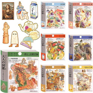 フレークシールとは... 写真やイラストに沿ってひとつずつカットされた、小さなシールのこと。 和紙素材に金箔押しのシールが23枚入っています。 パッケージは図鑑のような見た目になっており、表紙にはそれぞれのシールの説明が記載さ