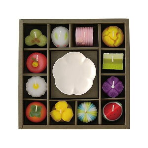 美しい四季を表現した和菓子ローソク。 白いお皿の燭台にのせ、火をつけると甘い香りがふんわり広がります。 ■仕様■ 小函寸法:W235×L228×H52mm セット内容:季節の和菓子12種
