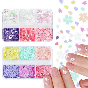 【桜ネイルデコレーション】2個セット 6仕切りケース入りサクラ型3Dラメ、12色のカラーバリエーション。収納や持ち運びに便利な商品です。ネイルアートや顔のデコレーションに最適で、キラキラ輝く効果をもたらします。異なる色を選んでネイルを...