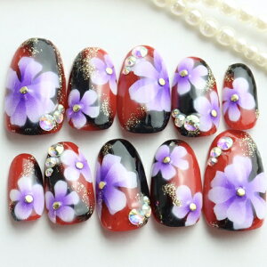 [長めミディアムラウンド]※サイズは商品画像よりお確かめください レッド×ブラック・ゴールドのニュアンスアート ぷっくりフラワー&ビジューが和装に映える和柄ネイル 【商