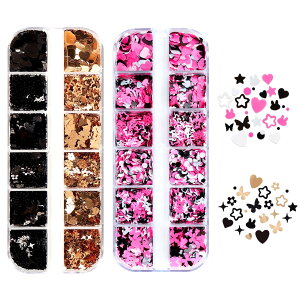 ケース入りサクラ型3Dラメ、12色のカラーバリエーション。収納や持ち運びに便利な商品です。ネイルアートや顔のデコレーションに最適で、キラキラ輝く効果をもたらします。異なる色を選んで