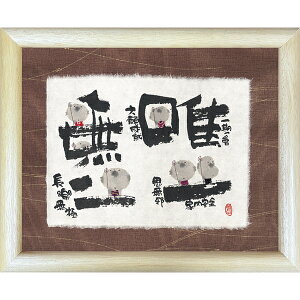 癒しの書家【御木幽石】の三つ窓額装です。ポストカードと小さなイラスト二枚を額装しました。可愛らしいお地蔵さんをはじめ、猫・ふくろう・お花などをモチーフにしたやわらかい絵柄と心温まる書のメッセージが描かれています。専用