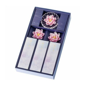【商品特徴】「祈る心」をお伝えしたいけれど、相手に気を使わせたくないという方から選ばれる紙箱のご進物。清らな哀しみを表現した色使いと繊細な蓮のローソクが美しく、白檀を基調としたフローラルの香りのお線香(煙少香)が、贈