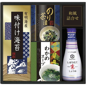 ●商品名/キッコーマン生しょうゆ&和食詰合せ NBL-20A●商品内容/有明海産味付海苔(3切6枚)・のり茶漬け(4.3g×2)・わかめスープ(5.3g×2)・キッコーマンしぼりたて生しょうゆ(200ml)×各1●箱サイズ/約25×2...