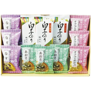 ●商品名/タニタ食堂監修減塩みそ汁・白子のり詰合せ ST-20●商品内容/タニタ食堂監修減塩みそ汁(あおさ・オクラとめかぶ・なす)・白子のり味のり(8切5枚)×各2●箱サイズ/約23×21.5×4cm●アレルゲン/小麦・えび●重量/約...