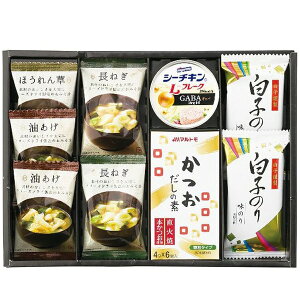 ●商品名/美味心 和風バラエティギフト EM-AE●商品内容/フリーズドライ味噌汁(油あげ7.2g・ほうれん草6.2g×各1個、長ねぎ6.3g×2個)、マルトモかつおだしの素(4g×6個)×1個、白子のり味のり(8切5枚)×2個...