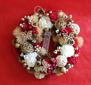 詩鼓のクリスマスバージョンです。クリスマスツリーを壁にかざるような壁掛タイプのクリスマスアレンジ。 木のボックスには、プリザーブドフラワーと木の実などをちりばめた和のクリスマス。 流れるようなリボンや自然をそのまま演出