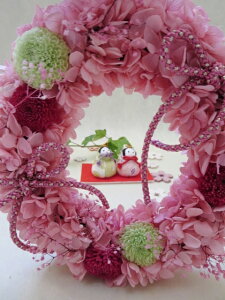 ポンポンマムの可愛いピンクのリースです。 ビンクとゴールドの組紐が入り、可愛いだけでなく華やかさもあるリースです。 1年中飾ってお楽しみいただけますが、季節の小物を添えると一段し華やぎます。 リーススタンドやワイヤースタン