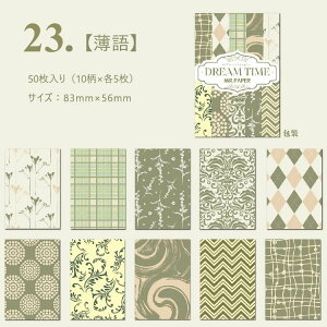 内 容:50枚入り(10柄×各5枚) 素 材:薄手ペーパー 軽型紙 サイズ:83mm×56mm 素 材:和紙 マスキングテープ素材