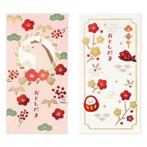 ●縁起の良い定番のお正月モチーフを金箔と赤箔で表現したお年玉袋です。 ●金箔部分は模様が入っており、キラキラと豪華なデザインです。 ●製品寸法:W87 × H168mm ●パッケージ寸法:W87 × H168 × D2mm ●1柄2枚