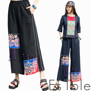 【商品説明】 エスニックな刺繍の切り替えが個性的でオシャレなガウチョパンツになります。 存在感ある華やかな刺繍が、着こなしにアクセントをプラスしてくれるオシャレな1本★ ウエストゴムとゆったりオーバーサイズで...