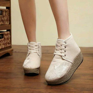 布靴 レディース 高? 厚底 スニーカー 春秋 刺繍入り 和風 チャイナ風 ラウンドトゥ 5.5cmヒール キャンバス地 ブラック ベージュstring