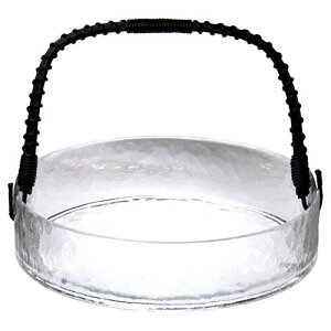 硝子手付き丸鉢 大切立タイプの大き目な、取手付き硝子鉢です。和食も蕎麦も、そして冷菓でも。涼しげな盛付けに、着色した籐の取っ手が彩りを加えます。※本体側面に取っ手を付けるための穴が開いていますので、多量の水や液状の物へ