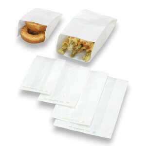 口を閉じたまま中身が見える紙袋でディスプレイ効果がバツグン。唐揚げ、コロッケ、枝豆、ドーナツ等にどうぞ。耐油耐水性紙を使用しているため、油もの等に対応できます。※食材の油、タレ等の液体量が多い場合は、事前に確認してく