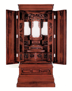 内部寸法:上段から天井までの高さ24cm。材質:紫檀系(グラナディロ) 内側屋久杉材。正面表面材:笠・台輪−紫檀系厚板貼り。戸板−紫檀系無垢。大戸軸−紫檀系厚板貼り。主芯材:MDF表面。