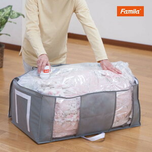 【ファミラ 掃除機のいらない圧縮収納ボックス9点セット】 圧縮袋と収納ボックスが一体化した便利アイテムです。 付属の専用吸引機で中の空気を抜くだけで、かさばる衣類をコンパクトにします...
