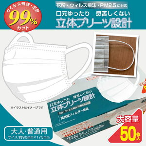 ■ 快適 マスク 大容量タイプ 50枚入り ふつうサイズ 高品質3層構造! 風邪、黄砂、飛沫、PM2.5、ハウスダスト、ホコリ対策にご使用下さい ・優れた防湿性 雨などの天候や外湿度などにあまり左右されないよう工夫されています。 ・通気性