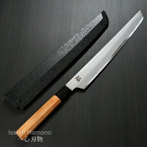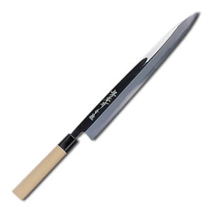 刃長270mm、「白虎」 白一鋼 切付柳刃270の左利き用です。高純度の、安来白一鋼(白紙一号)を、堺の鍛冶士が、伝統の技で鍛え、そして研ぎ上げた刀身に黒丹八角両輪柄を付け、美しい塗り鞘をセットにした...