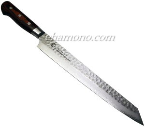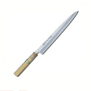 刃長270mmの銀三綱剣型柳刃包丁です。 ステンレスの新素材日立ヤスキ「銀三鋼」を従来の和包丁と同じように、堺の職人が1丁ずつ丹念に鍛え、研ぎ上げた全く新しい感覚の、和包丁です。 錆に強く、お手入れが楽でしかも...