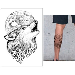 大きいサイズの満月と狼をデザインした水で貼るフェイクタトゥーステッカー。 男性からも女性からも人気の動物アニマルモチーフの入れ墨。 偽物の刺青シールはカップルや友達同士でおソロにも最適。 大きめサイズのフェイクタトゥシー