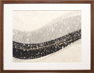 【画 題】星彩(せいさい) ※肉筆作品※【解 説】職人が一つ一つ丁寧に漉いた、「手漉き和紙」に墨で描いた味わい深い作品です。画面上を流れるような柔らかな2種類のラインが、星の放つ光りを表現しています。手漉き和紙の模様と