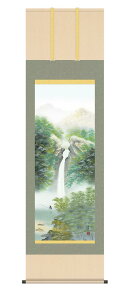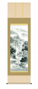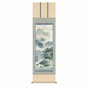 シリーズ山水画飾りモチーフ彩色山水 遥かな峰々から降りる涼風が麓の木々に活力を与える、渓流の姿を描きました。 深山渓谷の壮大な景色を雄渾の筆づかいで描いた逸品です。仕様正絹本表装 軸先:陶器 ※桐箱畳折収納生産国日本サイズ