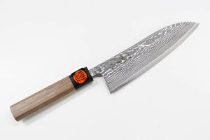 こちらは1丁1丁本鍛造・手打ちによって仕上げた三徳包丁です。兵庫県三木市の鍛冶職人、田中誠貴(しげき)さんが丹精込めて鍛造した包丁です。 究極の鋼材『粉末ステン・スーパーゴールド2』を使用した逸品です。片側16層になるステン