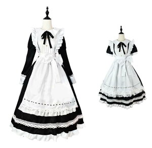 セット内容:ワンピース+エプロン+髪飾り+リボン英国風クラシックスタイルのロングメイドドレス♪定番の白黒デザインが一番可愛い♪小さいサイズから大きいサイズまで豊富なサイズ展開!男女問わずお使いいただけます。ハロウィー