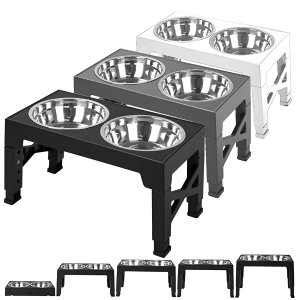 食事中の頭や腰の負担を軽減するペット用食器。高さ3段階調節が可能。ペットの体への負担を和らげ、食事をもっと快適に!フードとお水や、2種類のフードなど、自由に組み合わせて使える。ステンレス製の食器を取り外して洗えます。...