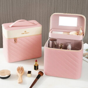 散らかりがちな化粧品をお洒落に収納するメイクボックス。【2サイズあり】【鏡付き】【PU革】収納トレイとワイドな下の段でコスメ道具をすっきりと納めることができます。ミラー付きなので、いつでもどこでもメイクやスキンケアが出来