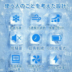 "Type-c入力コネクタ パソコンや車の中のUSB充電器、モバイルバッテリーなどからいつでも充電できます。 おススメの6つのポイント Point1 冷却プレート スイッチを入れたらで素早くクールダウン point2...