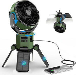 商品名 充電式 扇風機 卓上 吊り下げ LEDライトの電力 3W 出力電力 16W 入力電圧 DC5.0V/2.0A バッテリー容量 20000mAh 風量調節タイプ >無段階風量調整 羽根 5+3枚 カラー グリーン 手動上下調節の...
