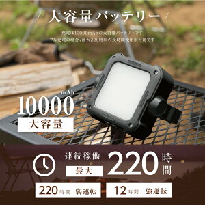 キャンプや防災用として多機能な高輝度LEDライト。USB充電式で10000mAh大容量、最大220時間可能。充電器にもなり、設置は卓上、吊るし、懐中電灯の3WAY。