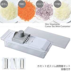 包丁を使わずにおろしからスライス・千切りなどの基本カットがこの1台で完結、スリム調理器セット。 4種類のプレートベースを付け替えることで、おろし・スライス・千切と用途に分けて使えます。 受け皿として便利な容器付きで...
