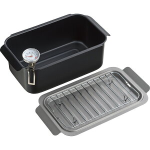 すっきり。温度計付きで調理もしやすく、アミ付きの蓋でバットの収納場所にも困りません。長方形なのでコンパクトながらも長さのある食材にも対応します。●容量=約1.9l(深さ約7.9cm)、温度計・アミ