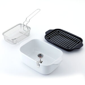 【商品について】 大きめの食材もゆったり揚げられる温度計付きワイドタイプ揚げ鍋と角型揚げざるのセット。 角型なので長い食材もゆったり揚げられます。蓋がバットになるのでとっても便利。 ...