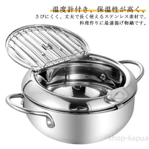 温度計付き、保温性が高く、さびにくく、丈夫で長く使えるステンレス素材で、料理作りに最適揚げ物鍋です。さらに、アルミ鍋と違って、酸性やアルカリ性に強いため、素材が溶ける心配もいりません。周りには丸く囲むような油はねそ防