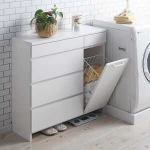 洗濯カゴと収納チェストがひとつになったアイデア商品洗濯カゴを扉の中に隠して収納できる、サニタリーチェストです。生活感が見えてしまう脱衣カゴや衣類、小物をこれひとつにまとめて収納できます。扉を閉めるとホワイトのすっきり