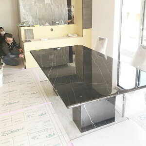 ブラック大理石で仕上げた大型のダイニングテーブルです。 お客様のご希望の形状、サイズで製作をさせていただいたオーダーメイド家具です。 クラシックスタイル、モダンなテイストやイタリアスタイルのインテリアとも相性が良いお品