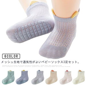 滑り止めが付いた赤ちゃん用メッシュソックスの 3足セット。薄手のメッシュ素材で、通気性抜群です。綿素材で小さい赤ちゃんの肌にも優しい肌触り。靴下の底に滑り止めシリコンが付いていて、屋内で走る時や屋外の遊び時に足を保護し