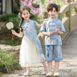 ・性別: ユニセックス・スタイル: 中華風・主な素材: ポリエステル55%・シーズン: 夏・カラー展開: 男児セット(巾着付き)、女児スカートセット・サイズ展開: 90cm、100cm、110cm、120cm、130cm、140cm、...