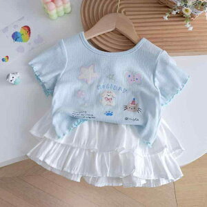 ・スタイル: 韓国版・セット内容: 上着、スカート・対象: 子供・対象年齢: 3〜8歳、100〜140cm・季節: 夏・袖丈: 半袖・フード: なし・厚さ: 薄手・柄: カートゥーン・素材: 綿・主な生地 состав: 綿90%、ス...