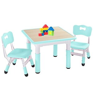 キッズテーブルと椅子2脚セット 高さ調節可能な子供用テーブルとチェアセット 3〜8歳用 拭きやすい 学習/絵かき/ダイニング 教室/保育園/家庭用 CPC&CE承認済み (3点セット) グリーンブラン...