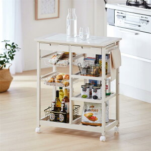 ▼ホワイト ▼ナチュラル ーデザイン・スタイリングー●天板にはめ込んだタイルがアクセントのキッチンワゴン●出来たての料理をテーブル横まで運べて便利●バスケットと棚板付きで食材やキッチン小物、ペットボトルの整理も簡単●小